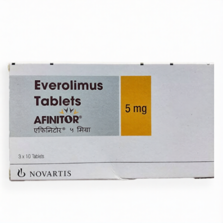Afinitor 5 is an oral anticancer preparation consisting of 5mg everolimus, a selective inhibitor of the mammalian target of rapamycin (mTOR) signalling pathway. Unlike other cytotoxic chemotherapeutic agents, which destroy cells with the highest rate of proliferation without being specific to them, everolimus is a type of drug that selectively inhibits the mTOR cascade, which is a key regulator of cellular functions in terms of growth, proliferation, and survival. This pathway is inhibited, thus suppressing the growth of the neoplastic cells, which is capable of inhibiting the development of tumours. Everolimus is mainly used in the treatment of malignancies with hyperactivity of the mTOR pathway because of its mechanism of action.