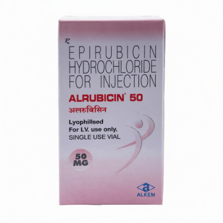 Alrubicin 50 injection is composed of Epirubicin, an antineoplastic agent which is a member of the anthracycline antibiotic group. It is mostly prescribed in the treatment of the solid tumours, especially the breast cancer and other malignancies. Epirubicin has a therapeutic effect which is mediated by perturbation of DNA replication and transcription in malignancies that proliferate rapidly. In a physiological context, genomic integrity is fundamental in the survival and multiplication of cells, and derailing these mechanisms, Epirubicin inhibits in an effective way the proliferation of tumour cells. Epirubicin has been considered to have a relatively low tendency towards cardiotoxicity and maintain a high anticancer activity when compared with other anthracycline drugs, which is why it is used either as monotherapy or in combination with other chemotherapeutic drugs.