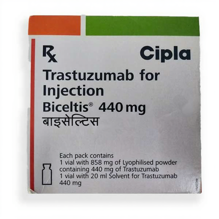 Biceltis 440 injection is a Trastuzumab formulation that is used in the treatment process of the selected HER2-positive breast and gastric malignancies. It is a group of specific biologic antineoplastic agents and operates its anti-cancerous action by specific selection to the human epidermal growth factor receptor-2 (HER2) on tumour cells. The specific blockage of these pathway disturbs the abnormal cell signalling pathway that contribute to uncontrolled proliferation and spread and thereby inhibiting the disease progression and truncating the tumour burden of the affected individuals.