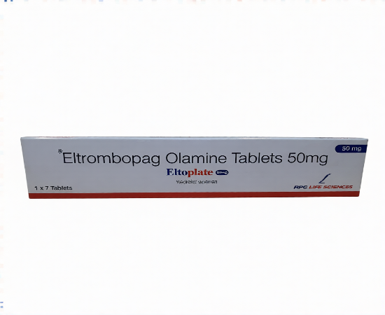 Eltrombopag, which is a part of Eltoplate 50 tablet, is a thrombopoietin receptor agonist that is used to stimulate platelet production in patients with certain haematological issues. It is mostly recommended to treat disorders that are mainly marked by thrombocytopenia as a result of disrupted platelet genesis. In physiological conditions, thrombopoietin binds to bone marrow stimulating it to produce platelets; Eltrombopag mimics this process by binding to megakaryocyte thrombopoietin receptors, thus stimulating platelet production and reducing the risk of haemorrhage. It is an oral agent that is used when other treatment solutions have not yielded enough results.