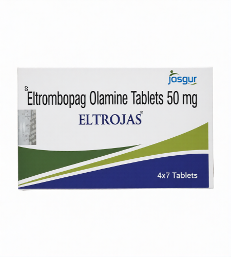 Eltrombopag, which is a part of Eltrojas 50 tablet, is a thrombopoietin receptor agonist that is used to stimulate platelet production in patients with certain haematological issues. It is mostly recommended to treat disorders that are mainly marked by thrombocytopenia as a result of disrupted platelet genesis. In physiological conditions, thrombopoietin binds to bone marrow stimulating it to produce platelets; Eltrombopag mimics this process by binding to megakaryocyte thrombopoietin receptors, thus stimulating platelet production and reducing the risk of haemorrhage. It is an oral agent that is used when other treatment solutions have not yielded enough results.