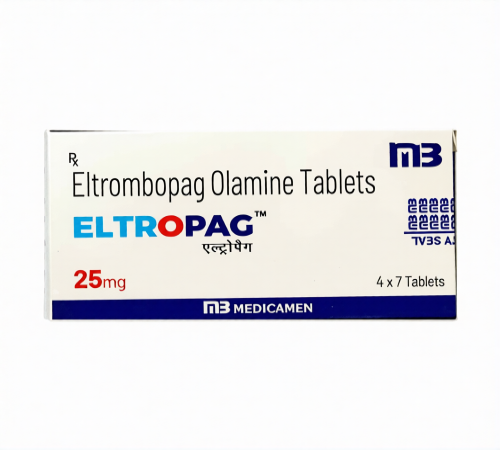 Eltrombopag, which is a part of Eltropag 25 tablet, is a thrombopoietin receptor agonist that is used to stimulate platelet production in patients with certain haematological issues. It is mostly recommended to treat disorders that are mainly marked by thrombocytopenia as a result of disrupted platelet genesis. In physiological conditions, thrombopoietin binds to bone marrow stimulating it to produce platelets; Eltrombopag mimics this process by binding to megakaryocyte thrombopoietin receptors, thus stimulating platelet production and reducing the risk of haemorrhage. It is an oral agent that is used when other treatment solutions have not yielded enough results.