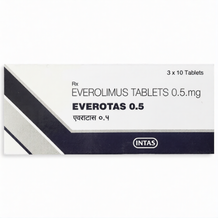 Everotas 0.5 is an oral anticancer preparation consisting of 0.5mg everolimus, a selective inhibitor of the mammalian target of rapamycin (mTOR) signalling pathway. Unlike other cytotoxic chemotherapeutic agents, which destroy cells with the highest rate of proliferation without being specific to them, everolimus is a type of drug that selectively inhibits the mTOR cascade, which is a key regulator of cellular functions in terms of growth, proliferation, and survival. This pathway is inhibited, thus suppressing the growth of the neoplastic cells, which is capable of inhibiting the development of tumours. Everolimus is mainly used in the treatment of malignancies with hyperactivity of the mTOR pathway because of its mechanism of action.