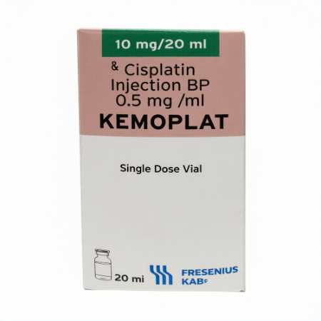 Kemoplat 10 injection is a platinum-based chemotherapeutic agent of 10mg cisplatin which is used to treat various solid tumours. Cisplatin is a member of alkylating-like cytotoxic agents. It is believed to work by developing covalent cross-linked association with the DNA in malignant cells; hence, interfering with DNA replication and transcription. The subsequent genomic damage causes tumour cell proliferation inhibition and eventual apoptosis hence reducing tumour burden and controlling disease progression.