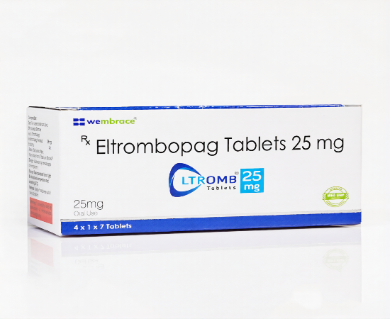 Eltrombopag, which is a part of Ltromb 25 tablet, is a thrombopoietin receptor agonist that is used to stimulate platelet production in patients with certain haematological issues. It is mostly recommended to treat disorders that are mainly marked by thrombocytopenia as a result of disrupted platelet genesis. In physiological conditions, thrombopoietin binds to bone marrow stimulating it to produce platelets; Eltrombopag mimics this process by binding to megakaryocyte thrombopoietin receptors, thus stimulating platelet production and reducing the risk of haemorrhage. It is an oral agent that is used when other treatment solutions have not yielded enough results.