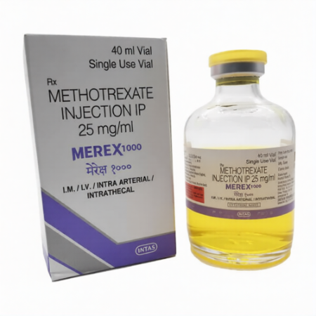 Methotrexate, Merex Injection 1000mg is an antineoplastic drug belonging to an antimetabolites group, and an antagonist of folic acid. It has many applications in management of different cancers and autoimmune diseases. The medication disrupts the process of DNA replication in the quickly growing cells thus suppressing the growth of the tumor. Cancer cells are more susceptible to its action since they are known to divide rapidly. Nonetheless, toxicity can be caused by the normal rapid proliferating cells like those of the bone marrow and gastrointestinal lining. The high dose therapy and where drug control delivery is necessary is preferred in injectable form.