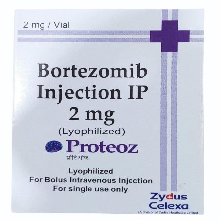 Proteoz 2 injection has 2mg of bortetzomib, which is an antineoplastic agent as a proteasome inhibitor. The antitumor effect of the drug is mediated by a selective inhibition of the 26S proteasome complex, which is a part of intracellular proteolysis. Blockage of this system causes the build up of the abnormal proteins in malignant cells, hence, interfering with the cell-cycle and apoptosis. The medication finds numerous applications in the treatment of the haematological malignancies, especially multiple myeloma.