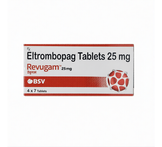 Eltrombopag, which is a part of Revugam 25 tablet, is a thrombopoietin receptor agonist that is used to stimulate platelet production in patients with certain haematological issues. It is mostly recommended to treat disorders that are mainly marked by thrombocytopenia as a result of disrupted platelet genesis. In physiological conditions, thrombopoietin binds to bone marrow stimulating it to produce platelets; Eltrombopag mimics this process by binding to megakaryocyte thrombopoietin receptors, thus stimulating platelet production and reducing the risk of haemorrhage. It is an oral agent that is used when other treatment solutions have not yielded enough results.