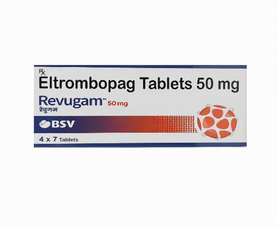Eltrombopag, which is a part of Revugam 50 tablet, is a thrombopoietin receptor agonist that is used to stimulate platelet production in patients with certain haematological issues. It is mostly recommended to treat disorders that are mainly marked by thrombocytopenia as a result of disrupted platelet genesis. In physiological conditions, thrombopoietin binds to bone marrow stimulating it to produce platelets; Eltrombopag mimics this process by binding to megakaryocyte thrombopoietin receptors, thus stimulating platelet production and reducing the risk of haemorrhage. It is an oral agent that is used when other treatment solutions have not yielded enough results.