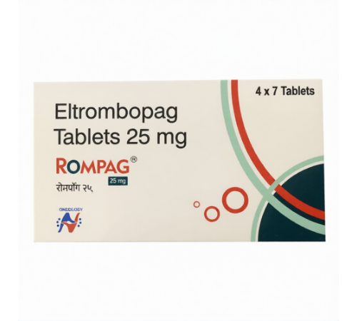 Eltrombopag, which is a part of Rompag 25 tablet, is a thrombopoietin receptor agonist that is used to stimulate platelet production in patients with certain haematological issues. It is mostly recommended to treat disorders that are mainly marked by thrombocytopenia as a result of disrupted platelet genesis. In physiological conditions, thrombopoietin binds to bone marrow stimulating it to produce platelets; Eltrombopag mimics this process by binding to megakaryocyte thrombopoietin receptors, thus stimulating platelet production and reducing the risk of haemorrhage. It is an oral agent that is used when other treatment solutions have not yielded enough results.