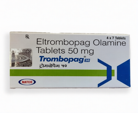 Eltrombopag, which is a part of Trombopag 50 tablet, is a thrombopoietin receptor agonist that is used to stimulate platelet production in patients with certain haematological issues. It is mostly recommended to treat disorders that are mainly marked by thrombocytopenia as a result of disrupted platelet genesis. In physiological conditions, thrombopoietin binds to bone marrow stimulating it to produce platelets; Eltrombopag mimics this process by binding to megakaryocyte thrombopoietin receptors, thus stimulating platelet production and reducing the risk of haemorrhage. It is an oral agent that is used when other treatment solutions have not yielded enough results.