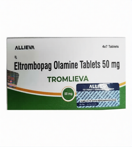 Eltrombopag, which is a part of Tromlieva 50 tablet, is a thrombopoietin receptor agonist that is used to stimulate platelet production in patients with certain haematological issues. It is mostly recommended to treat disorders that are mainly marked by thrombocytopenia as a result of disrupted platelet genesis. In physiological conditions, thrombopoietin binds to bone marrow stimulating it to produce platelets; Eltrombopag mimics this process by binding to megakaryocyte thrombopoietin receptors, thus stimulating platelet production and reducing the risk of haemorrhage. It is an oral agent that is used when other treatment solutions have not yielded enough results.